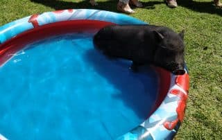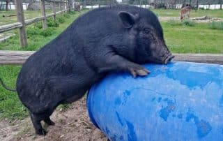 A Iscas a porca maravilha adora festas na barriga e vem pedir-nos carinho fazendo um ruidinho que se assemelha a um uivar de cachorro e deita-se a mostrar a sua barriga.